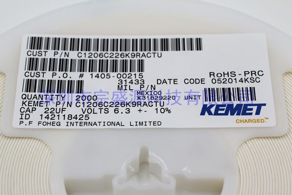 KEMET陶瓷电容 1206 6.3V 22UF C1206C226K9RACTU