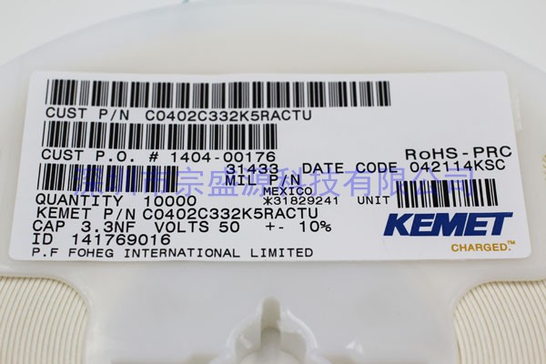 KEMET陶瓷电容 0402 50V 3.3NF C0402C332K5RACTU